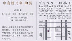 | 〔これまでの個展〕 中島勝乃利 陶展 2009. 9.15 -26 橋本美術 中島勝乃利 陶展 2007. 5.22 -6. 2 橋本美術 中島勝乃利 陶展 2006.12. 9 -22 ギャラリー顕美子 中島勝乃利 陶展 2005. 9.20 -10. 1 橋本美術 中島勝乃利 陶展 2004.10.30-11.13 ギャラリー顕美子 中島勝乃利 陶展 2003. 7 .8 - 7.19 橋本美術 中島勝乃利 作陶展 2002. 7.31 - 8. 6 日本橋島屋 中島勝乃利 陶展 2001.10.16-10.27 橋本美術 中島勝乃利 陶展 2000. 1.19 - 1.25 名鉄百貨店 |