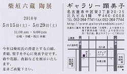| 〔これまでの個展〕 柴垣六蔵 陶展 2008.11.22-12.6 ギャラリー 顕美子 柴垣六蔵 陶展 2007. 3. 3 -17 ギャラリー 顕美子 柴垣六蔵 陶展 2005.12. 3-17 ギャラリー 顕美子 柴垣六蔵 陶展 2004. 7.24-8.7 ギャラリー 顕美子 柴垣六蔵 陶展 2003. 5.17-31 ギャラリー 顕美子 柴垣六蔵 陶展 2001.11.17-27 ギャラリー 顕美子 柴垣六蔵 陶展 2001. 1.19-2.3 ギャラリー 顕美子 柴垣六蔵 陶展 1999.12.11-25 ギャラリー 顕美子 |