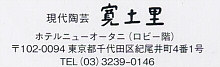 | 〔これまでの個展〕 鈴木 徹 陶展 2009. 9. 2 -8 天満屋岡山店 鈴木 徹 個展 2009. 5.16-21 銀座黒田陶苑 伊藤 渡・鈴木 徹 二人展 2008. 6.26-7.2 丸栄 鈴木 徹・若尾 経 二人展 2008. 4.12-20 長江洞画廊 鈴木 徹 作陶展 2007. 9.12-18 松坂屋 鈴木 徹 -緑釉薬- 2006. 5.13-18 銀座黒田陶苑 鈴木 徹 作陶展 2003.10.22-28 松坂屋 鈴木 徹 作陶展 2002.10 .8 -14 日本橋三越 |