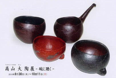 | 〔これまでの個展〕 高山 大 陶展 2009. 8. 2-30 galerie TURM 高山 大 陶展 2009. 6. 6-21 ギャラリー芽楽 高山 大 陶展 2008. 7. 1 -13 パラミタミュージアム 高山 大 展 プリミティブモダン 2007.11. 8-14 ギャラリー エスパス 高山 大+松川和弘 二人展 2007. 3. 7-13 松坂屋 高山 大 松川和弘 陶と磁 2007. 1. 2 -30 パラミタミュージアム 高山 大 展 2006. 2.16-27 画廊喫茶 パラス 高山 大 展 古代への航路 2005.10.27-11.2 ギャラリー エスパス 高山 大 clay works 2005 2005. 5.11 -17 ギャラリー スミ 高山 大の陶 展 2003 .8.20 -25 近鉄四日市 |