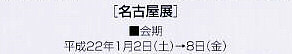 | 三年毎に丸栄画廊の年頭を飾る作者の新作展。大小二つの展示 スペースに並ぶ織部・志野・黄瀬戸の壷・花器・茶碗に陶俑には、桃 山陶の優美さと現代陶としての力強い表情を併せ持ち、玉山窯の門 弟を指導し、充実した作者の創作活動が伺われる。、 2010.1.2 |