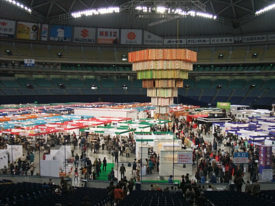 会場全景 中央は華道家小川珊鶴 着物を使ったモニュメント