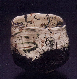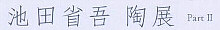 昨年、同じ画廊で初めて作品展を見て以来、この一年間の作 者の活動は目を見張るものがある。東京始め各地の個展で人 気を博し、個性豊かで図柄もユニークな織部・粉引はすっかり持 ち味となった。今展では、粉引を中心に大震災の記憶を図案に 留めた織部などが見所、ふくよかな味わいの煎茶をいただき、こ の上ないひと時を過ごすことができました。 2011.10.15 作品→ 〔これまでの個展〕 池田省吾 陶展 2010.12.4-12 画廊 文錦堂 |
