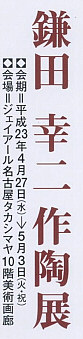 | 〔これまでの個展〕 鎌田幸二 作陶展 2009.12. 8-19 サン・ギャラリー住恵 鎌田幸二 展 2008. 4. 9-15 JR名古屋高島屋 鎌田幸二 作陶展 2007. 4.10-26 サン・ギャラリー住恵 鎌田幸二 作陶展 2005. 4.20-26 JR名古屋高島屋 鎌田幸二 展 2004.10.5-16 サン・ギャラリー住恵 鎌田幸二 作陶展 2002. 6.19-25 JR名古屋高島屋 鎌田幸二 作陶展 2002. 5.21-26 赤坂游ギャラリー 鎌田幸二 展 1999. 9.30-10.6 日本橋高島屋 |