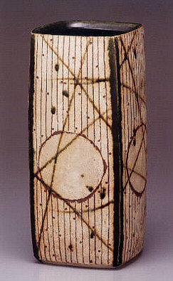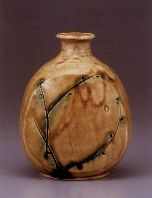 | 黄瀬戸扁壷 高 19.1p 幅 15.2p 奥行 11.8p | 織部条紋花器 高 42.9p 径 17.7p | |
