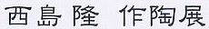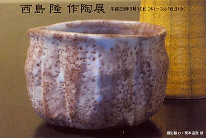 | 〔これまでの個展〕 西島 隆 作陶展 2010.11. 4 -10 丸栄 西島 隆 作陶展 2009.11.26-12.2 丸栄 西島 隆 作陶展 2009. 2.12- 2.18 丸栄 西島 隆 作陶展 2008. 8.21- 8.27 丸栄 西島 隆 作陶展 2007.11. 1-11. 7 丸栄 西島 隆 作陶展 2006.11. 2-11. 8 丸栄 西島 隆 作陶展 2005.11. 3-11. 9 丸栄 西島 隆 作陶展 2004.10.28-11. 3 丸栄 西島 隆 作陶展 2001.11.22-11.28 丸栄 西島 隆 作陶展 1999.10.28-11. 3 丸栄 |