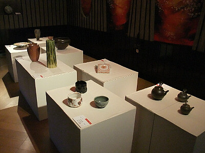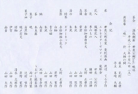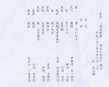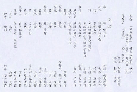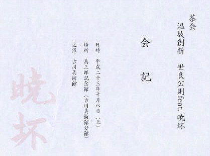 | 茶会 「温故創新」 世良公則 feat. 暁坏 日時 平成23年10月8日(土) 場所 為三郎記念館 ロック歌手世良公則さんは、最近若手陶芸作家とコラボした企画を次々と開催している。 今回は、古川美術館20周年記念企画として、趣のある庭園と日本家屋が美しい「為三郎 記念館」全館を使って現代の茶会を催した。煎茶席と薄茶席のセット、世良さんご本人の 挨拶に始まり、メンバーである若手陶芸家や日本茶マイスターがお手伝いに揃い、一味 違った雰囲気の茶事である。もちろん道具一式は、メンバーの作。床に世良さん愛用の 「エレキギター」や「ステージ衣装」なども飾られ、現代の茶を楽しませてくれた。 2011.10.8 |