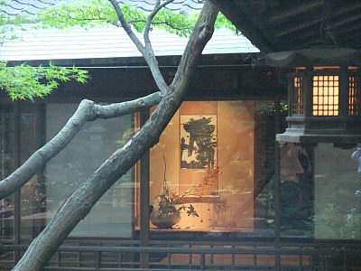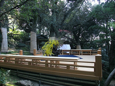 | 庭園に設けられた檜舞台 | 庭園から望む薄茶席「瓢の間」 軸は加藤亮太郎書 |