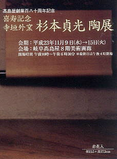| これまでの個展〕 杉本貞光 「陶」展 2009. 3.18-24 松坂屋 杉本貞光 一器一献 展 2006.12.4-12 松坂屋 杉本貞光 陶展 2005. 9. 7-13 松坂屋 杉本貞光 そったく茶碗と小壷たち 2004.10.19-29 サン・ギャラリー住恵 杉本貞光 一寸展 2004. 5. 7-20 サン・ギャラリー住恵 杉本貞光 陶展 2000. 4. 4-15 サン・ギャラリー住恵 杉本貞光 陶展 1999. 5.27-6.1 松坂屋 |
