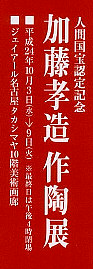 | 〔これまでの個展〕 加藤孝造 展 2010. 3.17-23 JR名古屋高島屋 加藤孝造 展 2008. 1. 2 -8 JR名古屋高島屋 加藤孝造 展 2006.10.4-10 松坂屋 加藤孝造 作陶展 2003.12.3-9 JR名古屋高島屋 加藤孝造 展 2003.9.18-23 松坂屋 加藤孝造 作陶展 2002.6.11-17 日本橋三越 加藤孝造 展 2000.10.5-11 松坂屋 |