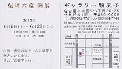 | 〔これまでの個展〕 柴垣六蔵 陶展 2011. 6.11 -25 柴垣六蔵 陶展 2010. 5.15 -29 柴垣六蔵 陶展 2008.11.22-12.6 柴垣六蔵 陶展 2007. 3. 3 -17 柴垣六蔵 陶展 2005.12. 3-17 柴垣六蔵 陶展 2004. 7.24-8.7 柴垣六蔵 陶展 2003. 5.17-31 柴垣六蔵 陶展 2001.11.17-27 柴垣六蔵 陶展 2001. 1.19-2.3 柴垣六蔵 陶展 1999.12.11-25 |