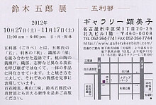 | 〔これまでの個展〕 鈴木五郎 百選展 2011. 7.22-8.6 ギャラリー顕美子 鈴木五郎 湯呑展 2009.10.17-31 ギャラリー顕美子 鈴木五郎の四都物語 2009. 2.18 -24 JR名古屋高島屋 鈴木五郎 展 2008.10.30-11.5 丸栄 鈴木五郎 黒の世界展 2006. 4. 3 -15 サン・ギャラリー住恵 鈴木五郎 展 2005. 3.23 -29 JR名古屋高島屋 鈴木五郎の世界 2003.11.6 -12 丸栄スカイル 鈴木五郎の世界展 2003. 7. 7 -18 サン・ギャラリー住恵 鈴木五郎の世界 2001. 7.13-27 サン・ギャラリー住恵 鈴木五郎の宇宙 2000. 5.18-24 丸栄スカイル 鈴木五郎カップ展 1999.12. 6-14 サン・ギャラリー住恵 |