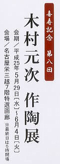 | 〔これまでの個展〕 木村元次 作陶展 2013. 1. 2 - 9 近鉄四日市 木村元次・将人 陶展 2012. 1.13 -25 ギャラリー・喫茶 花ごよみ 木村元次 作陶展 2011. 1.19 -25 名古屋三越 木村元次 作陶展 2009. 1.14 -20 名古屋三越 木村元次 釉薬の世界展 2008.10.24-29 近鉄四日市 木村元次 作陶展 2007. 2.13 -19 名古屋三越 木村元次 作陶展 2006. 1. 2 -10 近鉄四日市 木村元次 作陶展 2003. 1. 2 - 7 近鉄四日市 木村元次 作陶展 2001. 1.31-2.5 名古屋三越 |