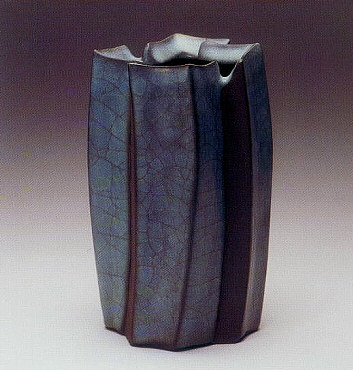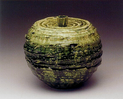 | 緑釉水指 (高 18.1×径 19.6p) | 青瓷花入 (高 26.8×幅 14.8×奥行 15.0p) |