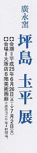 | 〔これまでの個展〕 廣永窯 坪島土平展 2011.10. 5-11 JR名古屋島屋 坪島土平 作陶展 2009.10. 7-13 JR名古屋島屋 坪島土平 作陶展 2007.10. 3- 9 JR名古屋島屋 坪島土平 作陶展 2006.10. 4-10 JR名古屋島屋 坪島土平 作陶展 2004.10. 6-12 JR名古屋島屋 坪島土平 作陶展 2003.10. 1- 7 JR名古屋島屋 坪島土平 作陶展 2002.10. 9-15 JR名古屋島屋 坪島土平 作陶展 2001. 9.19-25 JR名古屋島屋 廣永窯 坪島土平展 1999.10.19-29 サン・ギャラリー住恵 |