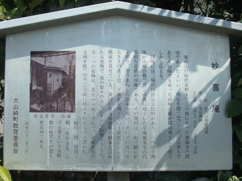 門前にある「妙喜庵」の由緒書 茶道に親しむ人々には一度は訪ねたい場所である