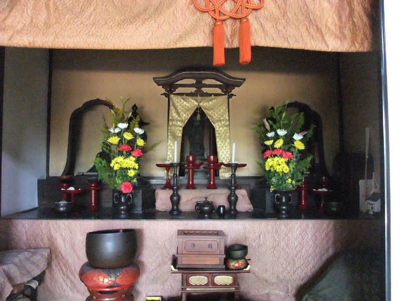 対月庵の仏壇には中央に聖観音、左側に利休坐像が祀られている