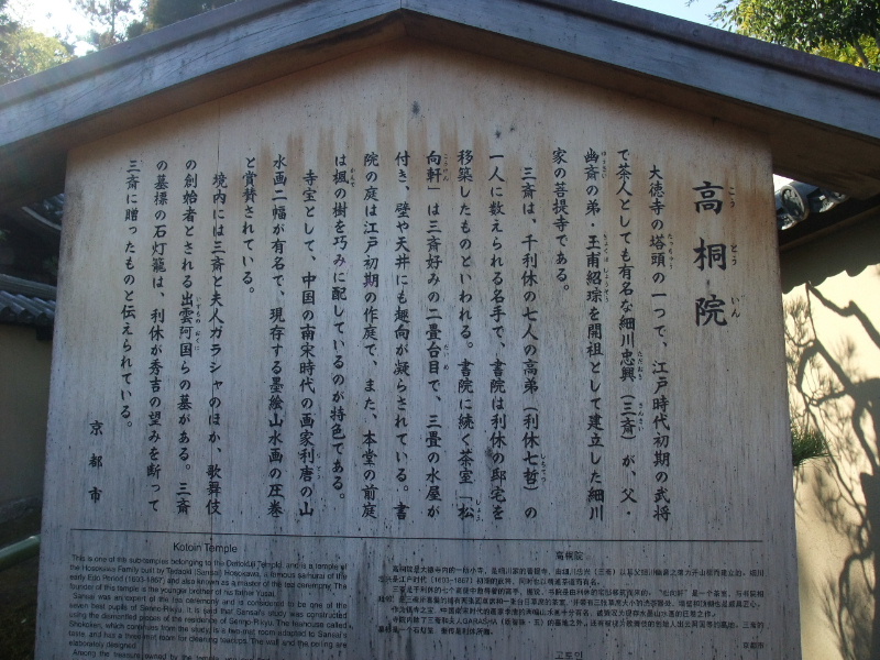 「高桐院」の由緒書 武将で茶人、光秀の三女 細川ガラシャ(明智 珠