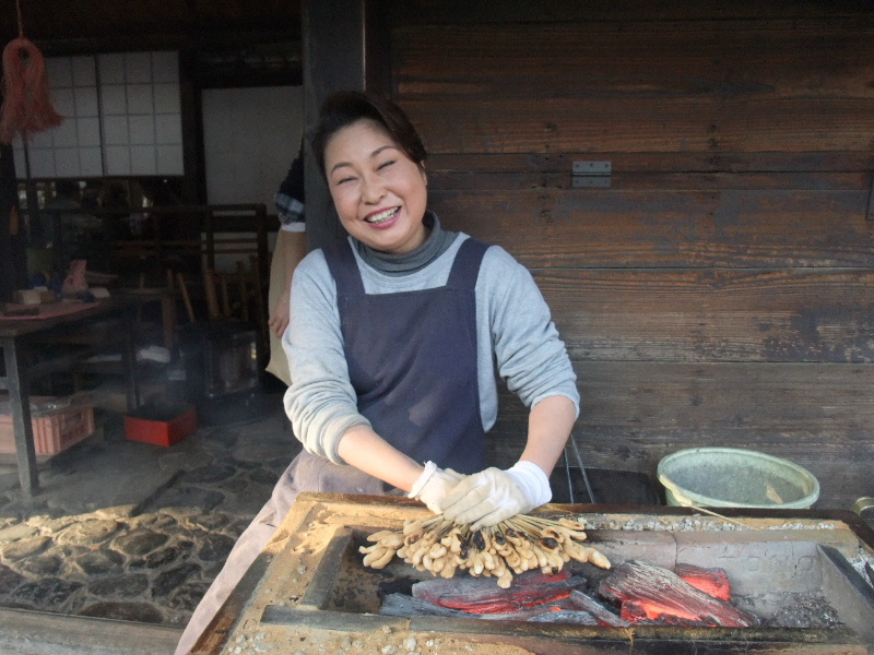 きな粉をまぶした一口大の串餅、店先の炭火で直に炙った素朴な風味